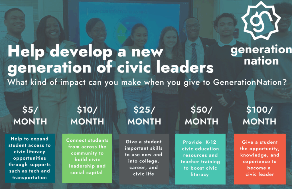 Support GenerationNation to build civic literacy, social capital, and civic leadership among K-12 students.