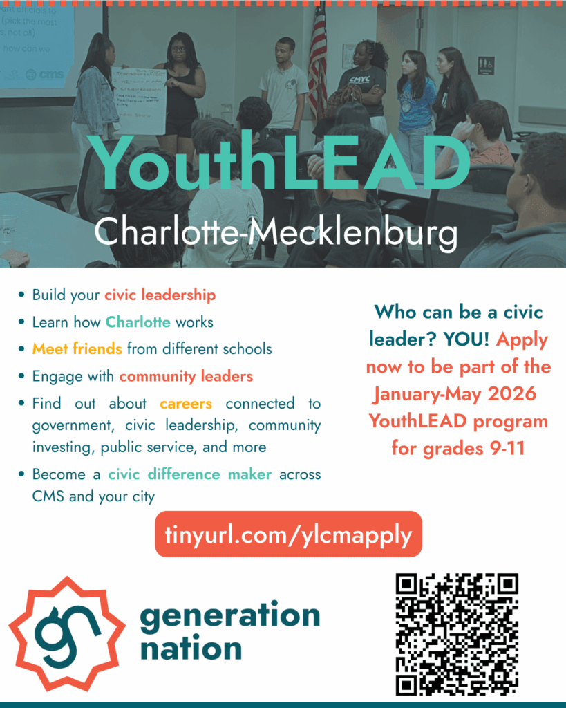 - Be a civic difference maker on the Charlotte-Mecklenburg Youth Council and additional leadership roles across CMS and your city.